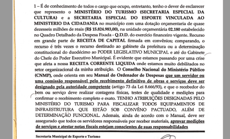 Paulo Marinho ainda relatou na carta que suas atribuições designadas pelo Ministério do Turismo não vêm sendo respeitadas por outros setores da gestão municipal e isso pode acarretar problemas graves diante da falta de assinatura em convênios, normas técnicas e fiscalizações.