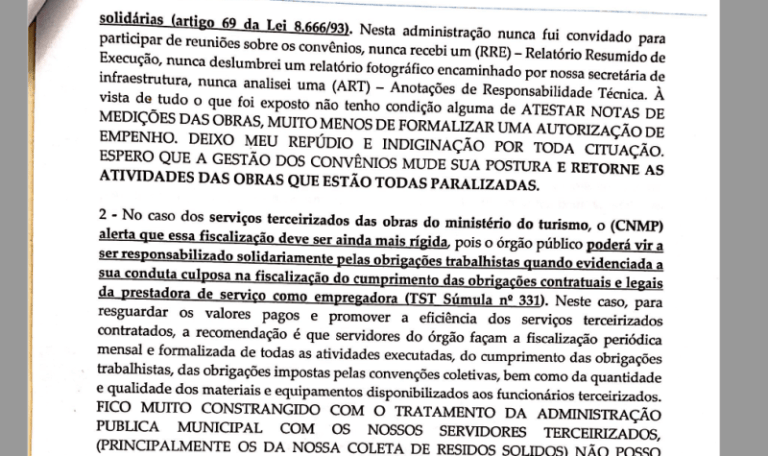 O ex-secretário colocou em cheque a fiscalização por parte da Prefeitura Municipal de Patos nas questões dos convênios e obras executadas por empresas privadas. Além das obras paradas, Paulo Marinho lamentou a forma que a gestão tem tratado os servidores terceirizados, com destaque aos garis. O ex-secretário citou súmulas que mostram a responsabilidade da Prefeitura Municipal de Patos, porém, vem sendo ignoradas pela gestão.