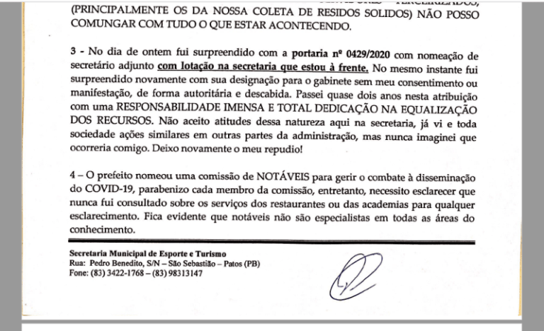 Paulo Marinho se disse decepcionado com o prefeito interino de Patos, razão pela qual não entregou a renúncia ao próprio gestor. O ex-secretário escreveu que não quer comungar com os posicionamentos políticos que interferem diretamente em questões de ordem técnica. Paulo também tornou público que nunca teve uma audiência com o interino e que este mesmo nunca atendeu uma ligação telefônica.