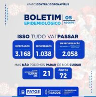 A Vigilância Epidemiológica da Secretaria de Saúde de Patos divulgou nesta quanta-feira, 05 de agosto, o total de 3.168 casos de Covid-19. Desse total, 2.058 estão em recuperação, 1.038 estão recuperados, o registro de 72 óbitos, e 21 novos casos nas últimas 24h.