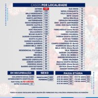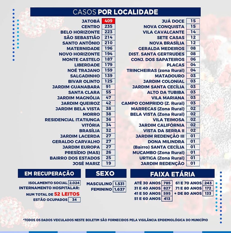 No levantamento feito dos leitos hospitalares, dos 52 disponíveis, 34 estão ocupados, enquanto que 2.024 dos infectados cumprem recuperação em isolamento domiciliar. Dos casos registrados por gênero, o sexo feminino está na frente com 1.637 casos, e na faixa etária até 40 anos foram registrados 1.612 casos.