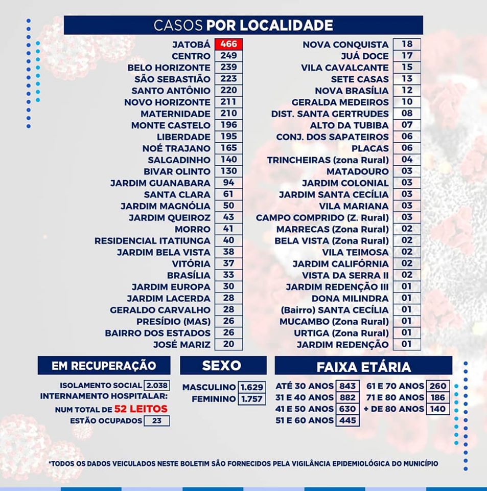 Desde o início da pandemia ate hoje, o total de infectados somam 3.386. Desses números, 2.038 estão em isolamento domiciliar, 1.252 pessoas já estão recuperadas e 73 óbitos foram registrados.