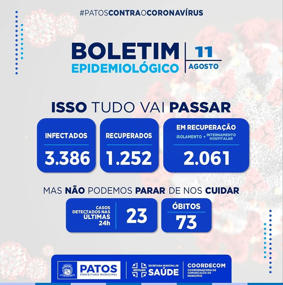 A Vigilância Epidemiológica da Secretaria de Saúde de Patos divulgou nesta terça-feira, dia 11 de agosto, que Patos registrou nas últimas 24 horas, 23 casos de pessoas infectadas pela Covid-19.