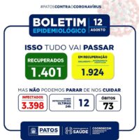 A Vigilância Epidemiológica da Secretaria de Saúde de Patos, divulgou nesta quarta-feira, dia 12 de agosto, que Patos registrou nas últimas 24 horas, 21 casos de pessoas infectadas pelo Covid-19.