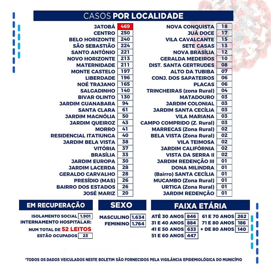 Desde o início da pandemia ate hoje, o total de infectados somam 3.398. Desses números, 1.924 estão em isolamento domiciliar, 1.401 pessoas já estão recuperadas e 73 óbitos foram registrados.