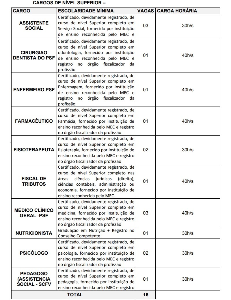 As vagas que serão oferecidas são para os níveis básico, médio/técnico e superior (para as áreas de saúde e educação).