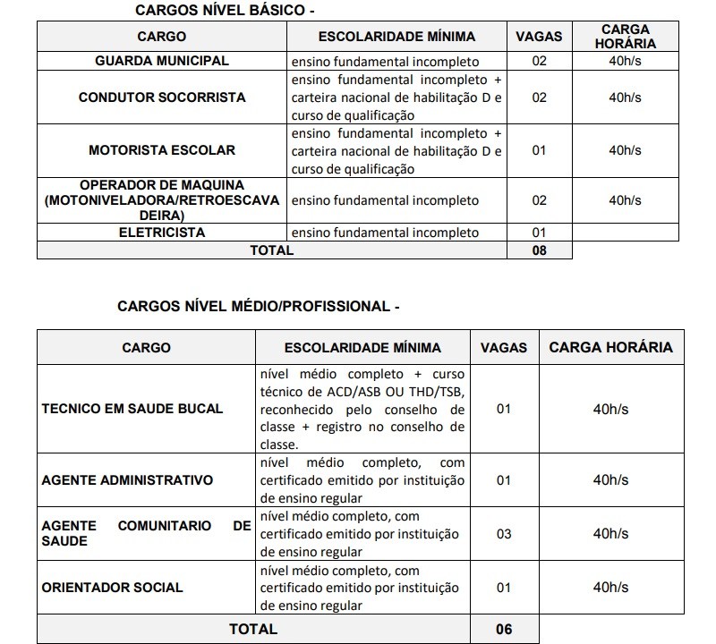 O edital ainda prevê que o valor da inscrição não poderá ser superior a R$ 61,67 para cargos do nível fundamental; R$ 81,67 para nível médio e R$ 115,00 para o superior, mas os detalhes completos só serão divulgados após a escolha da empresa.