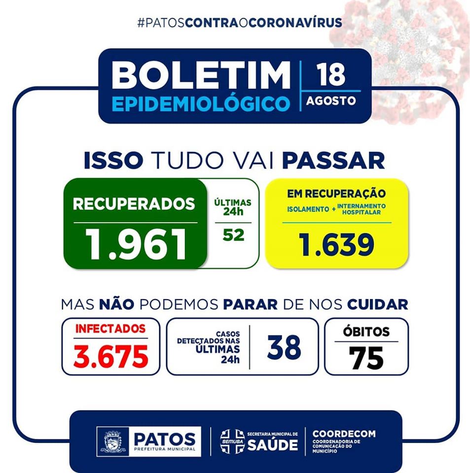 A Vigilância Epidemiológica da Secretaria de Saúde de Patos, divulgou nesta terça-feira, dia 18 de agosto, que a Capital do Sertão registrou nas últimas 24h, 52 recuperados, e 38 novos casos da Covid-19.