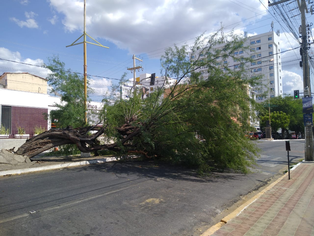 Uma algaroba caiu na Rua Pedro Firmino, cruzamento com a Floriano Peixoto, no centro de Patos, no começo da tarde desta sexta-feira, 21/08.