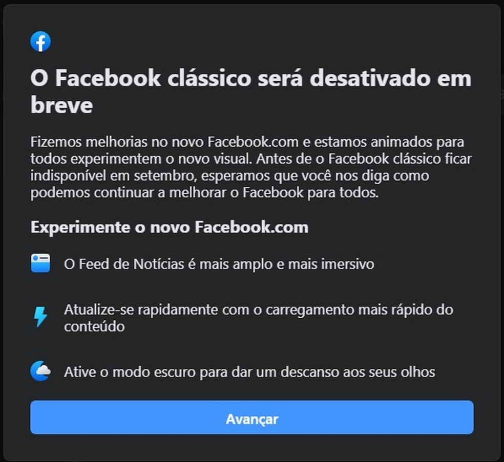 “O Facebook clássico será desativado em breve”, diz uma mensagem exibida para os usuários. “Fizemos melhorias no novo Facebook.com e estamos animados para todos experimentem o novo visual. Antes de o Facebook clássico ficar indisponível em setembro, esperamos que você nos diga como podemos continuar a melhorar o Facebook para todos.”