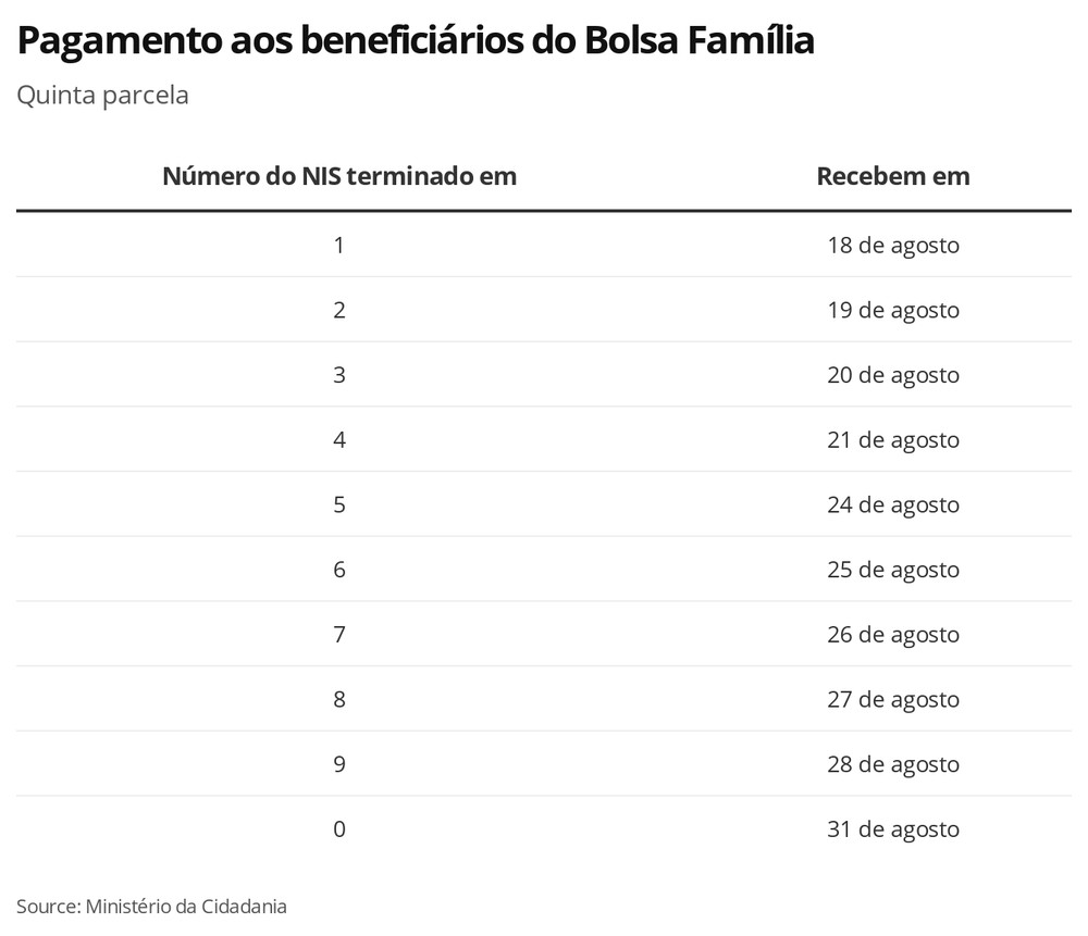 A Caixa Econômica Federal (CEF) paga nesta segunda-feira (24) a quinta parcela do Auxílio Emergencial para 1,9 milhão de beneficiários do programa que também fazem parte do Bolsa Família, cujo NIS termina em 5. Os pagamentos para esse grupo são feitos da mesma forma que o Bolsa.