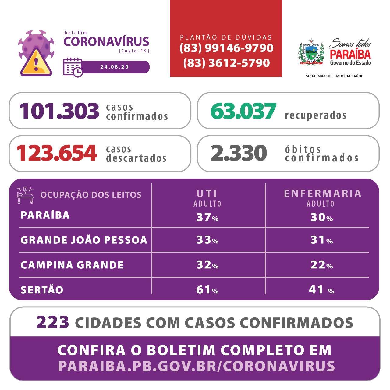 Nesta segunda, 24 de agosto, a Paraíba registrou 171 novos casos de Covid-19 e 22 óbitos confirmados desde a última atualização, 04 deles ocorridos nas últimas 24h. Até o momento, 101.303 pessoas já contraíram a doença, 63.037 já se recuperaram e 2.330, infelizmente, faleceram. Até o momento, 297.710 testes para diagnóstico da Covid-19 já foram realizados.