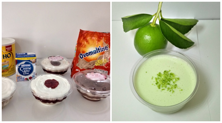 Mousses: abacaxi, maracujá, morango, limão, chocolate.