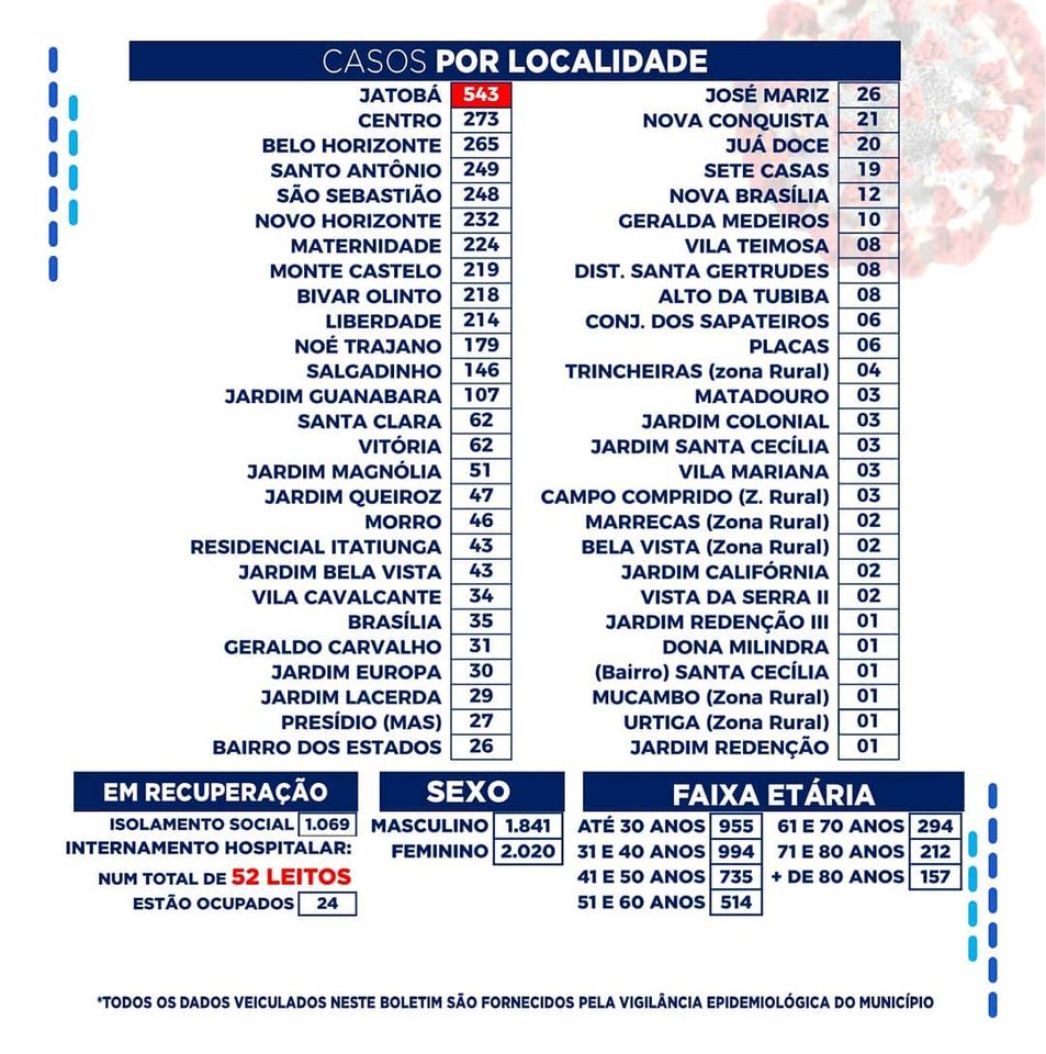 Desde o início da pandemia até hoje, o total de infectados somam 3.861. Desses números, 1.093 estão em recuperação, 2.685 estão recuperados e 83 óbitos.