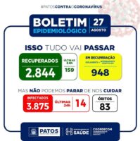 A Vigilância Epidemiológica da Secretaria de Saúde de Patos, divulgou nesta quinta-feira, dia 27 de agosto, que a Capital do Sertão registrou nas últimas 24h, 159 recuperados, e 14 novos casos da Covid-19.