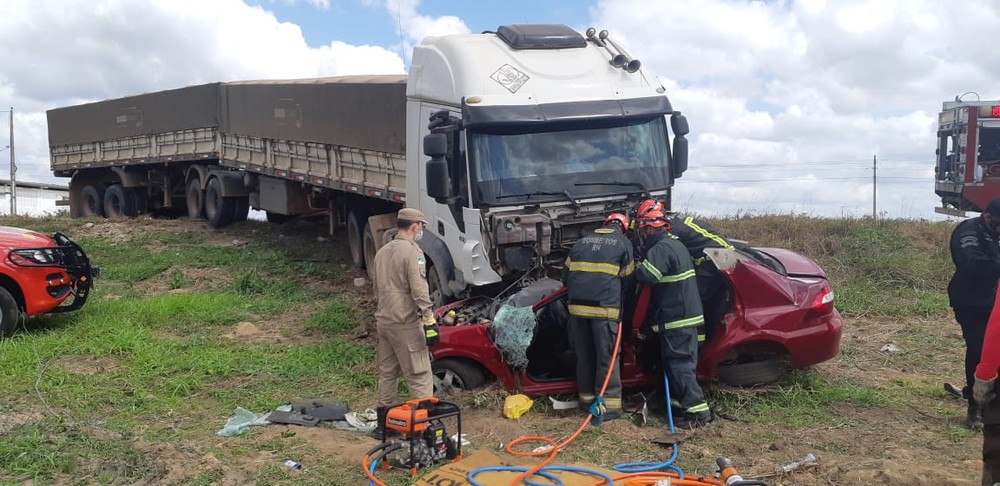 O Corpo de Bombeiros e Samu foram acionados para atender a ocorrência. O acidente aconteceu por voltas das 12h no Km 257 da rodovia. O carro de passeio modelo prisma, cor vinho, foi atingido lateralmente pela carreta. Após a batida, os veículos foram parrar em uma área descampada às margens da BR.