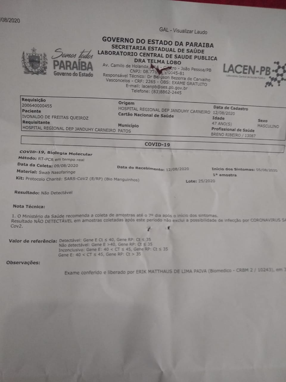 Nesta segunda-feira, 31/08, a família do técnico em eletrônica Ivonaldo de Freitas Queiroz, falecido recentemente em Patos, informou que seu exame deu negativo para Covid-19 (resultado em anexo).