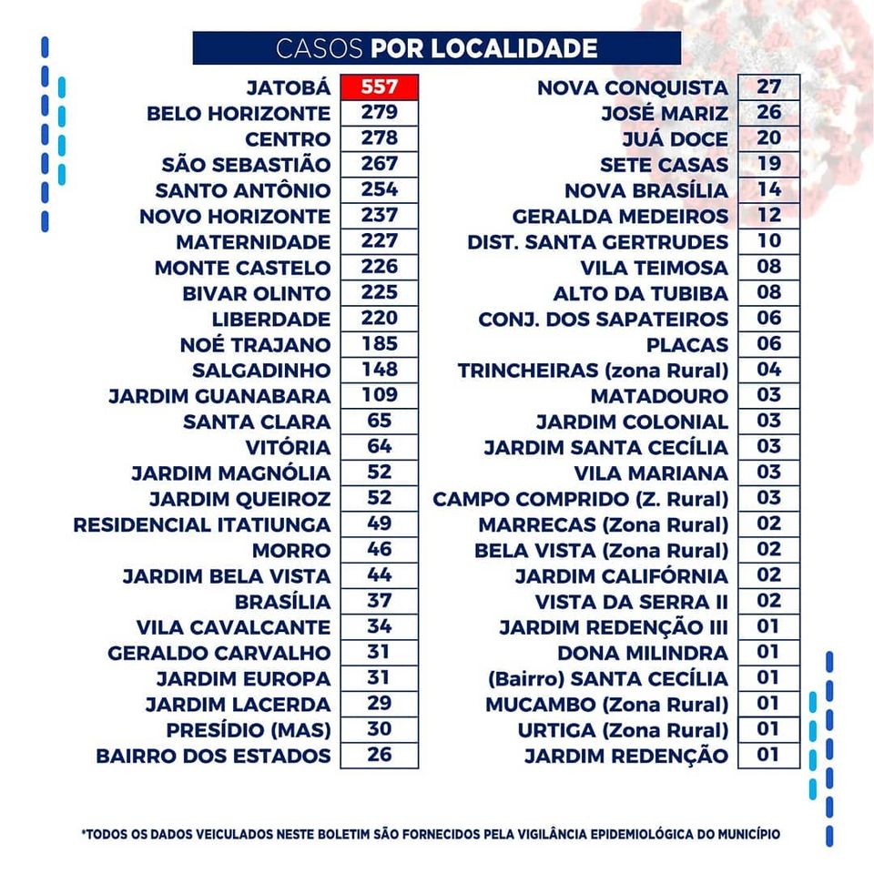 Todos os dados veiculados tanto no boletim quanto no relatório, são fornecidos pela Vigilância Epidemiológica do Município.
