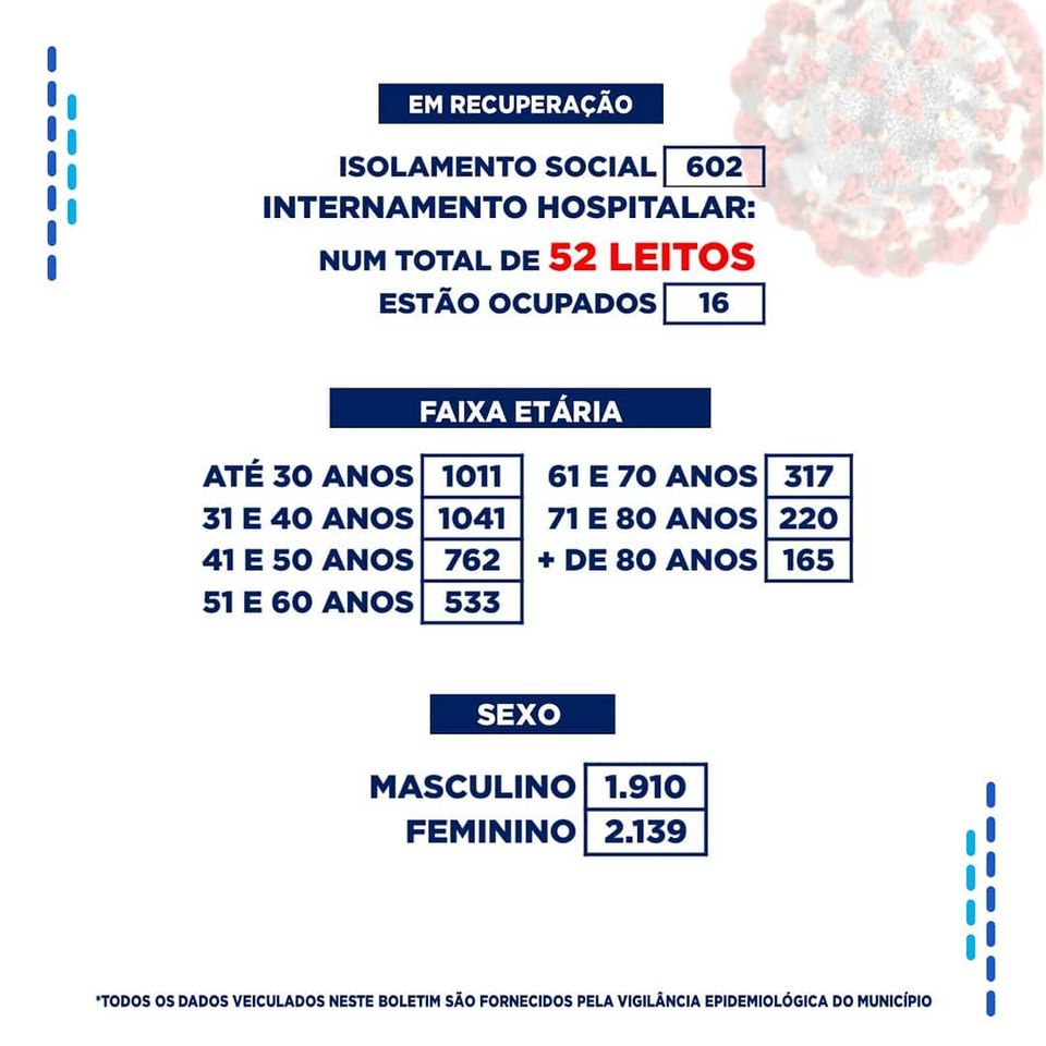 No levantamento feito dos leitos hospitalares, dos 52 disponíveis 16 estão ocupados. Dos casos registrados por gênero, o sexo feminino segue na frente com 2.139 casos, e na faixa etária até 40 anos foram registrados 2.052 casos.