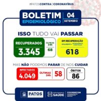 A Vigilância Epidemiológica da Secretaria de Saúde de Patos divulgou nesta sexta-feira, dia 04 de setembro, que a Capital do Sertão registrou nas últimas 24h, 68 recuperados, e 58 novos casos da Covid-19.