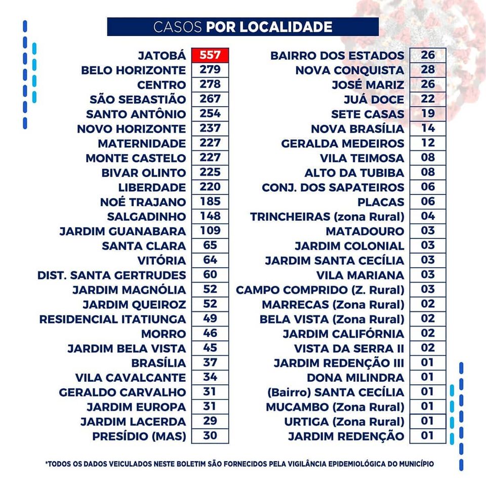 De acordo com os números desta sexta, a Zona Oeste de Patos, segue como a região com o maior índice de infectados da Covid-19, com 1.018 casos. Na separação por localidades, o Jatobá (bairro da Zona Sul), que não registrou nenhum caso de Covid-19 nas últimas 48h, permanece à frente com o registro de 557 casos de coronavírus.