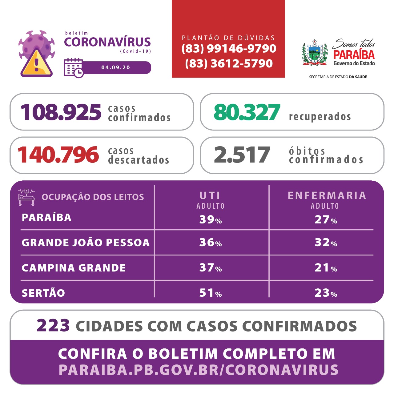 Os dados epidemiológicos e de ocupação de leitos estão disponíveis em www.paraiba.pb.gov.br/coronavirus.