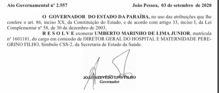 Dr. Umberto Junior já havia colocado o cargo à disposição dias atrás. Nesta quinta, atendendo um pedido seu, o governador João Azevêdo o exonerou.