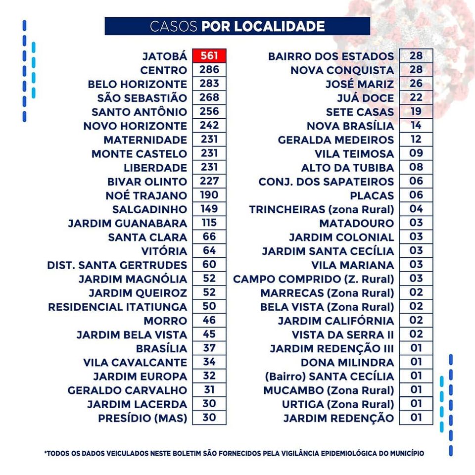 A mesma sorte não podem contar os moradores do bairro Jatobá onde 561 pessoas contraíram o vírus sendo a localidade com maior número de casos até agora.