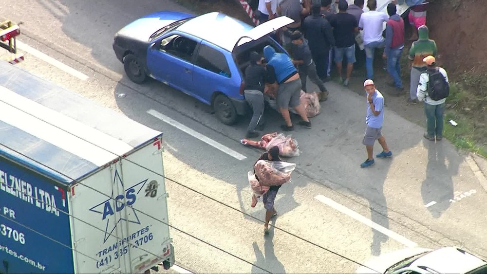Por volta das 8h, era possível ver algumas pessoas tentando atravessar a via carregando as peças. O saque só acabou com a chegada de uma viatura, meia hora depois do acidente.