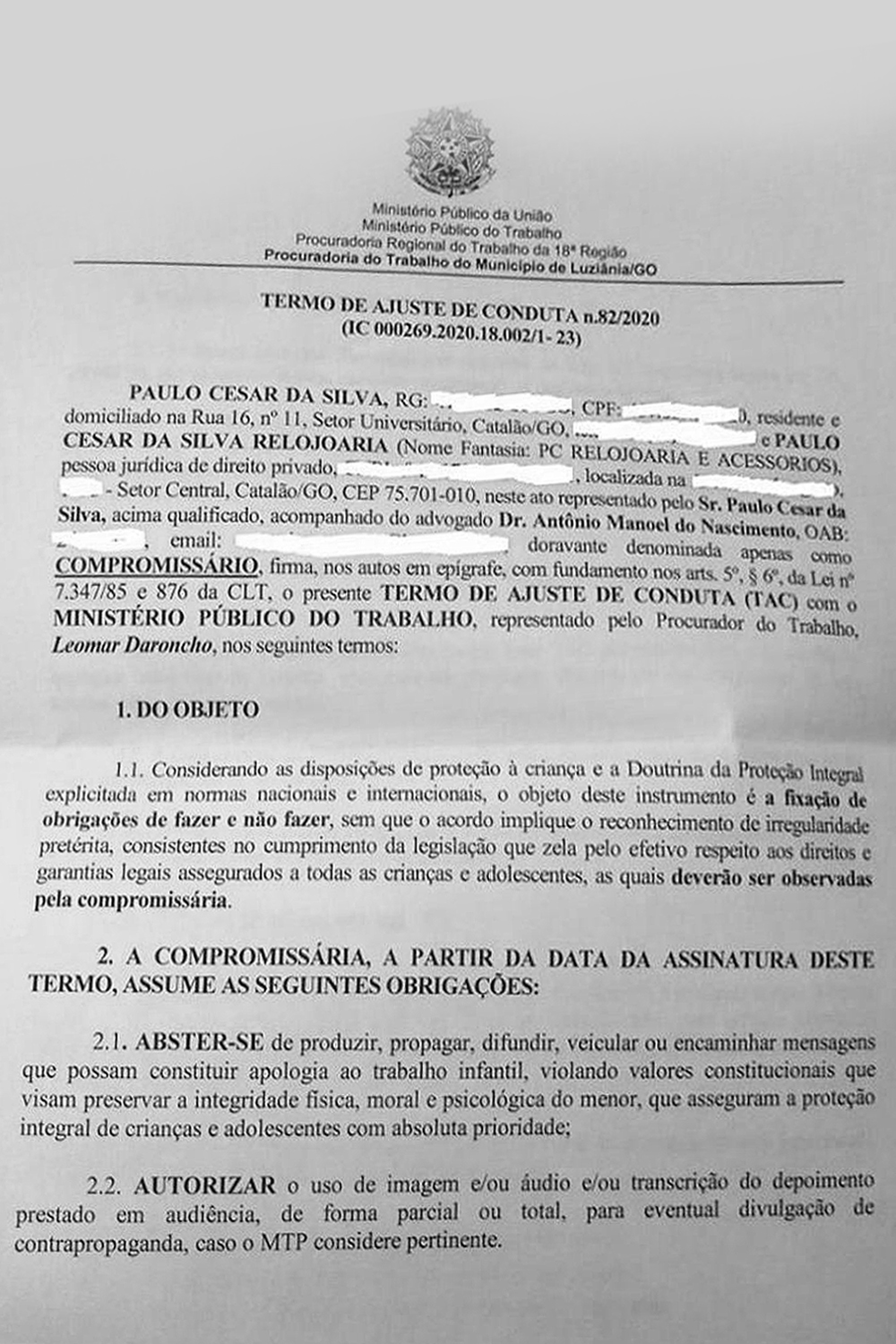 Por causa dessa fala, o relojoeiro precisou assinar um Termo de Ajustamento de Conduta, no qual se compromete a abster-se de divulgar qualquer apologia ao trabalho infantil e autoriza o uso do seu depoimento para eventuais campanhas de combate ao trabalho infantil. O descumprimento do termo pode resultar em multa de R$ 10 mil.