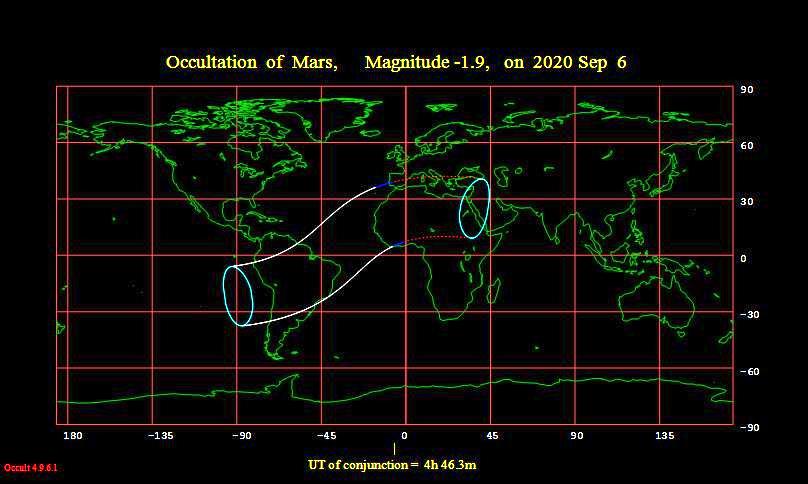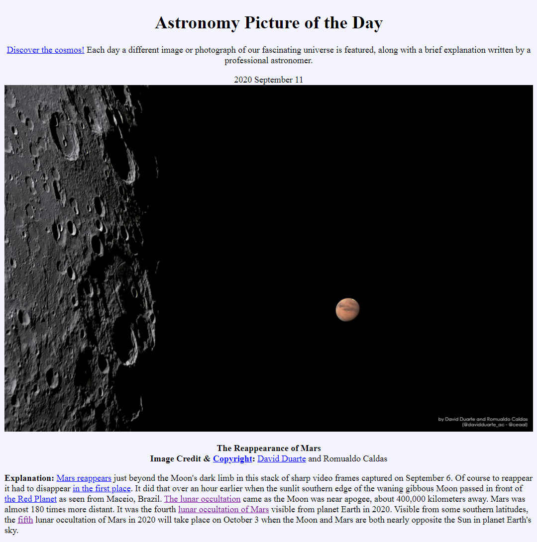 “Marte reaparece logo além do limbo escuro da Lua nesse empilhamento de nítidos quadros de vídeo capturados em 6 de setembro. É claro que, para reaparecer, primeiramente ele teve que desaparecer. Isso aconteceu mais de uma hora antes, quando a borda iluminada sul da Lua minguante passou em frente ao Planeta Vermelho, para observadores de Maceió, Brasil. A ocultação lunar ocorreu quando a Lua estava perto do apogeu, a cerca de 400 mil quilômetros de distância. Marte estava quase 180 vezes mais distante. Foi a quarta ocultação lunar de Marte visível a partir da Terra em 2020. Foi visível de algumas latitudes ao sul, a quinta ocultação lunar de Marte em 2020 ocorrerá em 3 de outubro, quando a Lua e Marte estão ambos quase opostos ao Sol no céu do planeta Terra.”