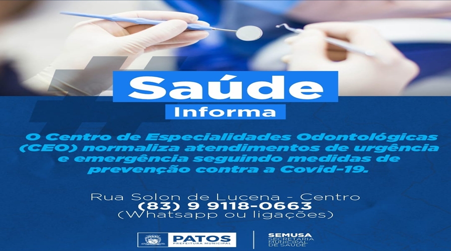 O Centro de Especialidades Odontológicas (CEO), órgão da Secretaria de Saúde de Patos, localizado na Rua Solon de Lucena (vizinho à casa lotérica), no centro, está com os atendimentos de urgência e emergência normalizados e de acordo com as medidas de prevenção contra a Covid-19.