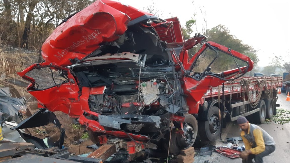 Segundo os bombeiros, a suspeita é que o motorista da van tentou desviar de um grande galho que caiu na pista por conta de uma queimada e atingiu o caminhão que estava no sentido contrário.