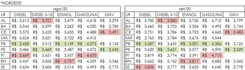 A pesquisa também comprara os valores de agosto e mostra que no estado é mais vantajoso abastecer com etanol do que com gasolina. Também foram pesquisados os valores médios do diesel-s10 (R$ 3,65) e GNV (R$ 3,12).