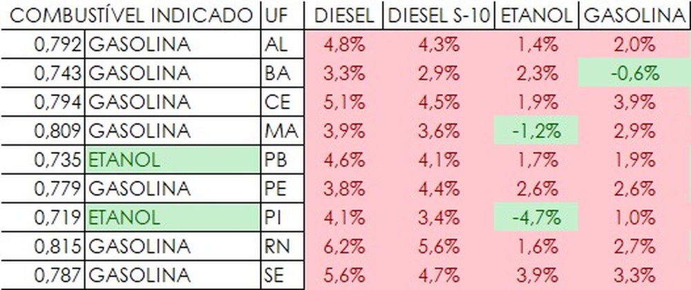 Já o etanol custa R$ 3,20, enquanto o maior preço, no Rio Grande do Norte, é R$ 0,61 mais caro, custando R$ 3,81.