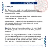 A Vigilância Epidemiológica da Secretaria de Saúde de Patos divulgou nesta terça-feira, dia 22 de setembro, que a Capital do Sertão registrou nas últimas 24h, 48 recuperados e 40 novos casos da Covid-19.