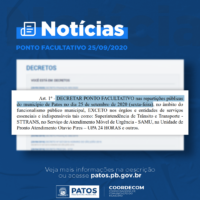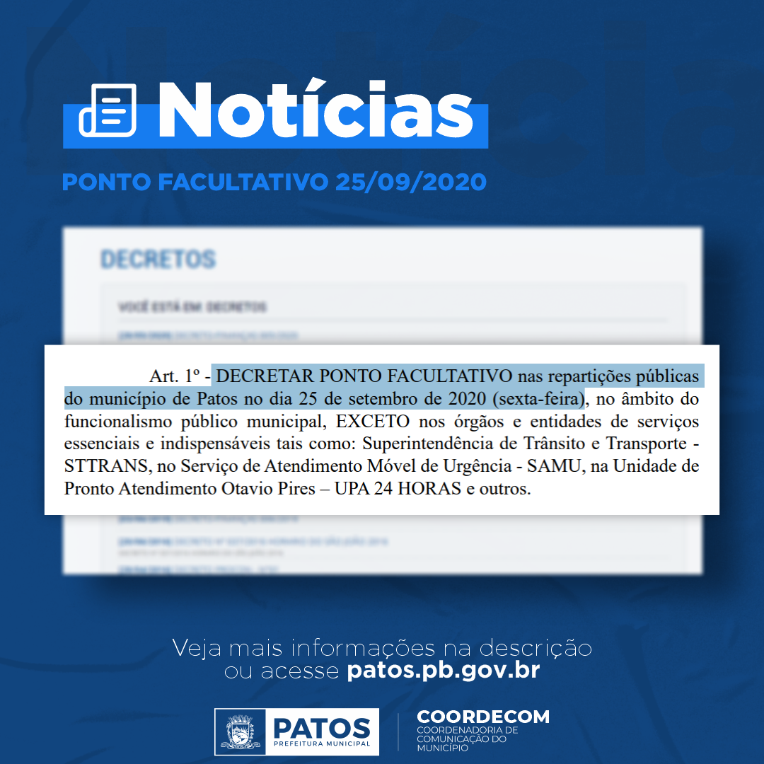 O prefeito interino de Patos, Dr. Ivanes Lacerda, decretou ponto facultativo nas repartições públicas do município de Patos, na sexta-feira, 25 de setembro, no âmbito municipal.