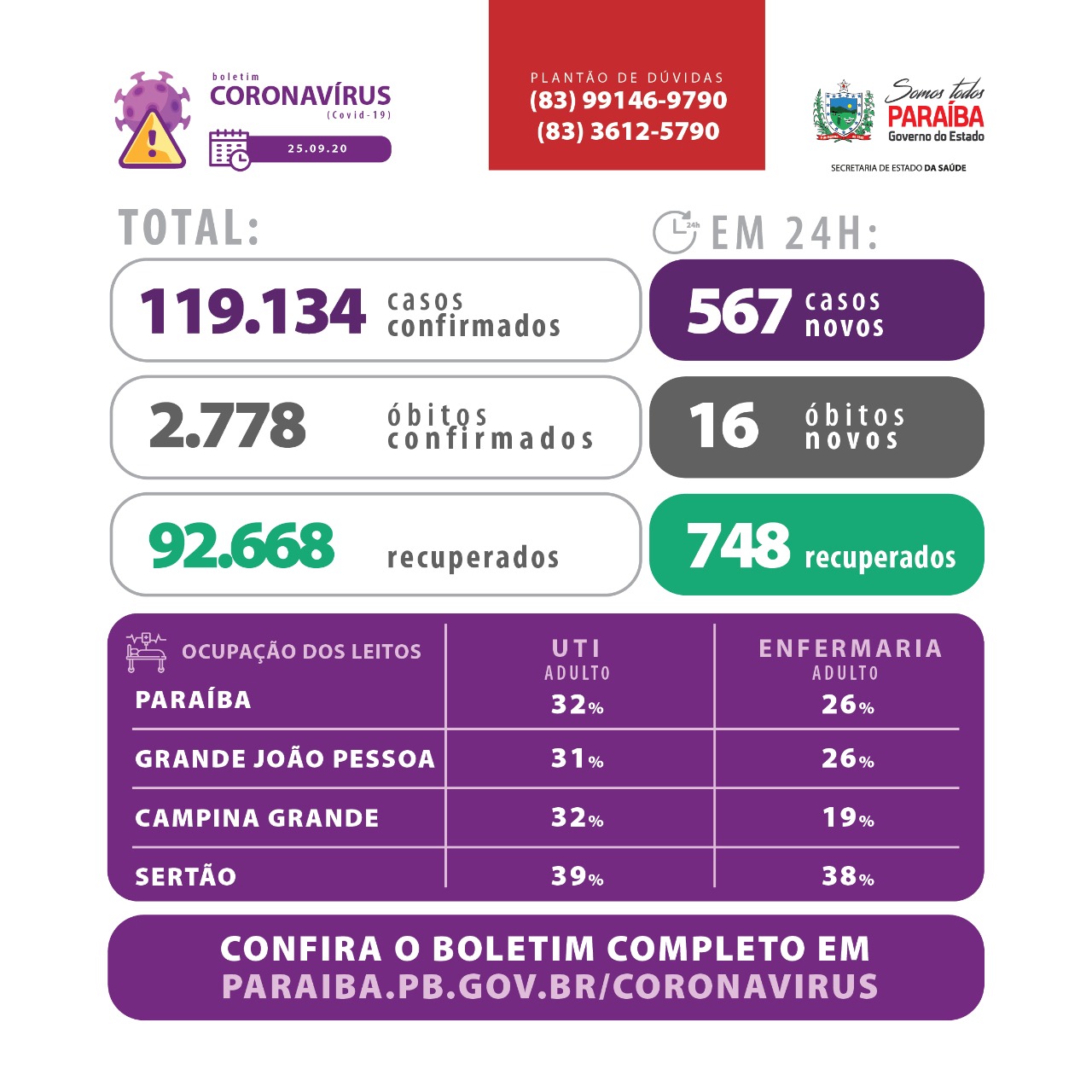 Os dados epidemiológicos com informações sobre todos os municípios e ocupação de leitos estão disponíveis em: www.paraiba.pb.gov.br/coronavirus.