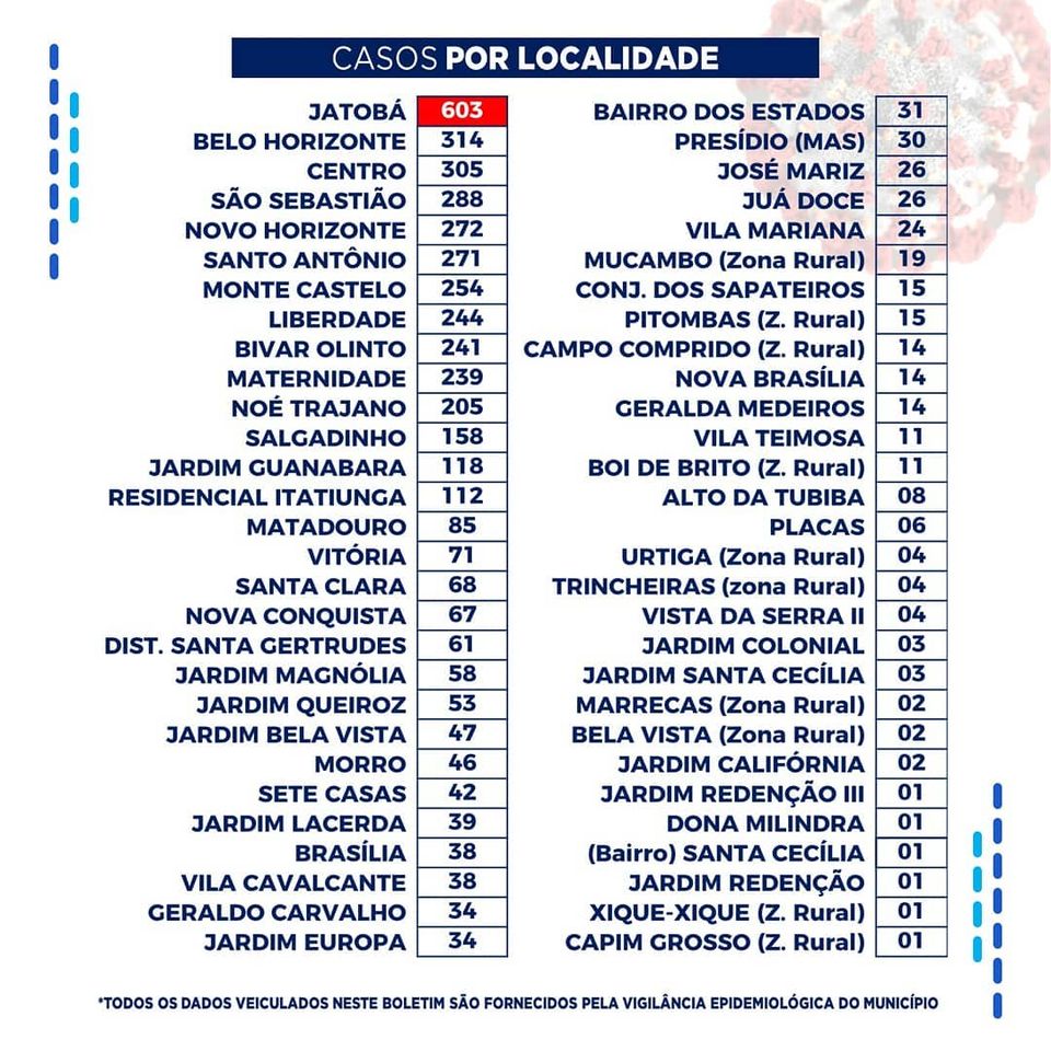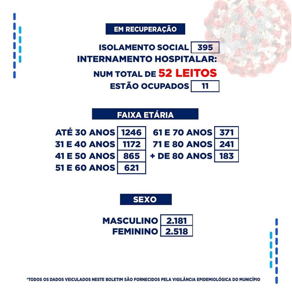 No levantamento feito dos leitos hospitalares, dos 52 disponíveis, 11 estão ocupados. Dos registros de infectados feitos por localidade, o bairro do Jatobá segue na frente com 603 casos. Por gênero, o sexo feminino segue na frente com 2.518 casos, e na faixa etária até 40 anos foram registrados 2.418 casos.