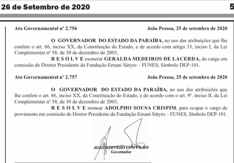 Ao mesmo tempo, Geralda Medeiros de Lacerda, esposa do advogado José Lacerda, foi exonerada do cargo que ocupou por vários anos. Seu esposo é membro do PSB em Patos, partido do ex-governador Ricardo Coutinho.