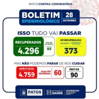 A Vigilância Epidemiológica da Secretaria de Saúde de Patos divulgou nesta segunda-feira, dia 28 de setembro, que a Capital do Sertão registrou neste final de semana, 93 recuperados, e 60 novos casos da Covid-19.