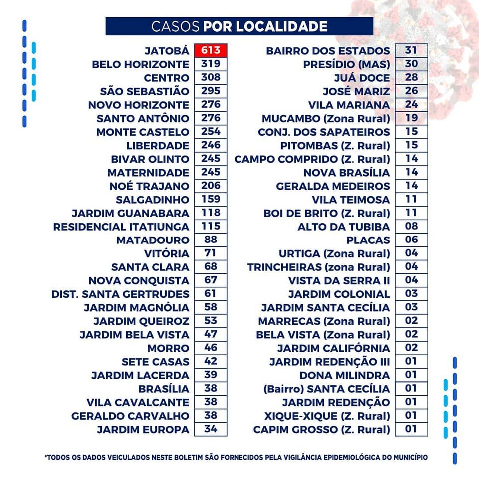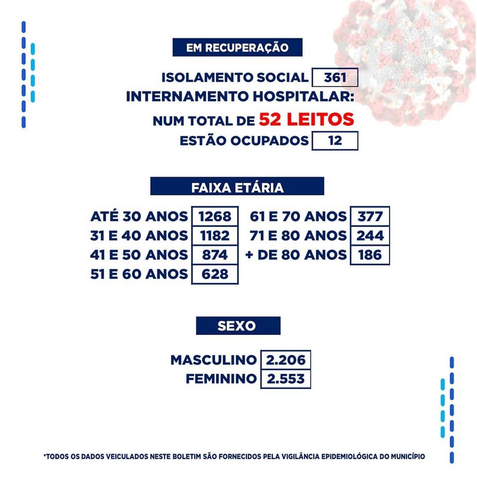 No levantamento feito dos leitos hospitalares, dos 52 disponíveis, 12 estão ocupados. Dos registros de infectados feitos por localidade, o bairro do Jatobá segue na frente com 613 casos. Por gênero, o sexo feminino segue na frente com 2.553 casos, e na faixa etária até 40 anos foram registrados 2.450 casos.