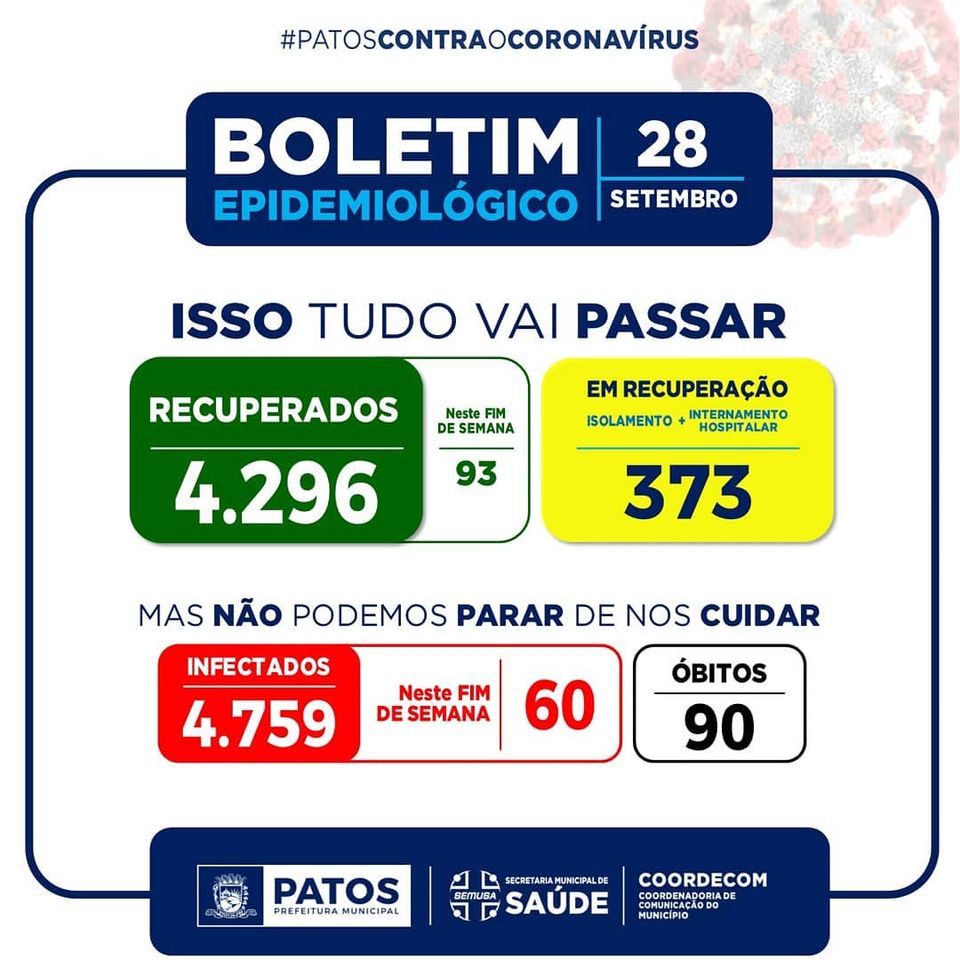 A Vigilância Epidemiológica da Secretaria de Saúde de Patos divulgou nesta segunda-feira, dia 28 de setembro, que a Capital do Sertão registrou neste final de semana, 93 recuperados, e 60 novos casos da Covid-19.