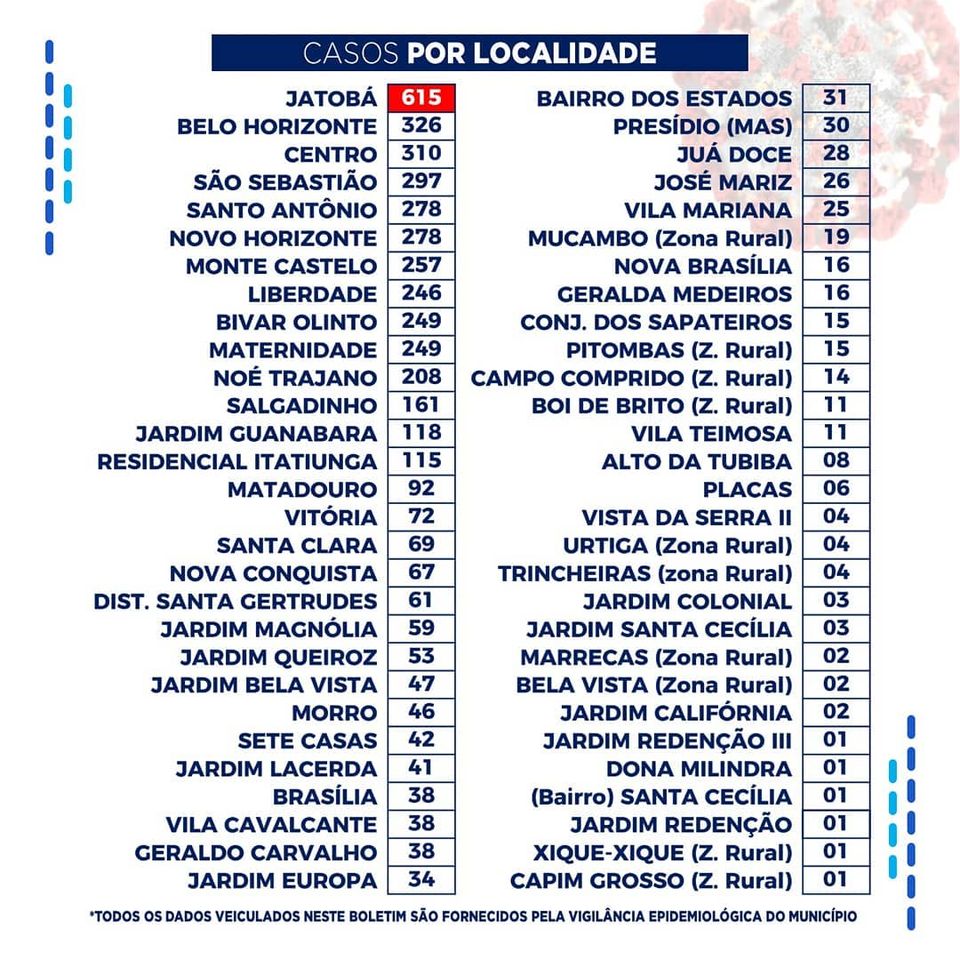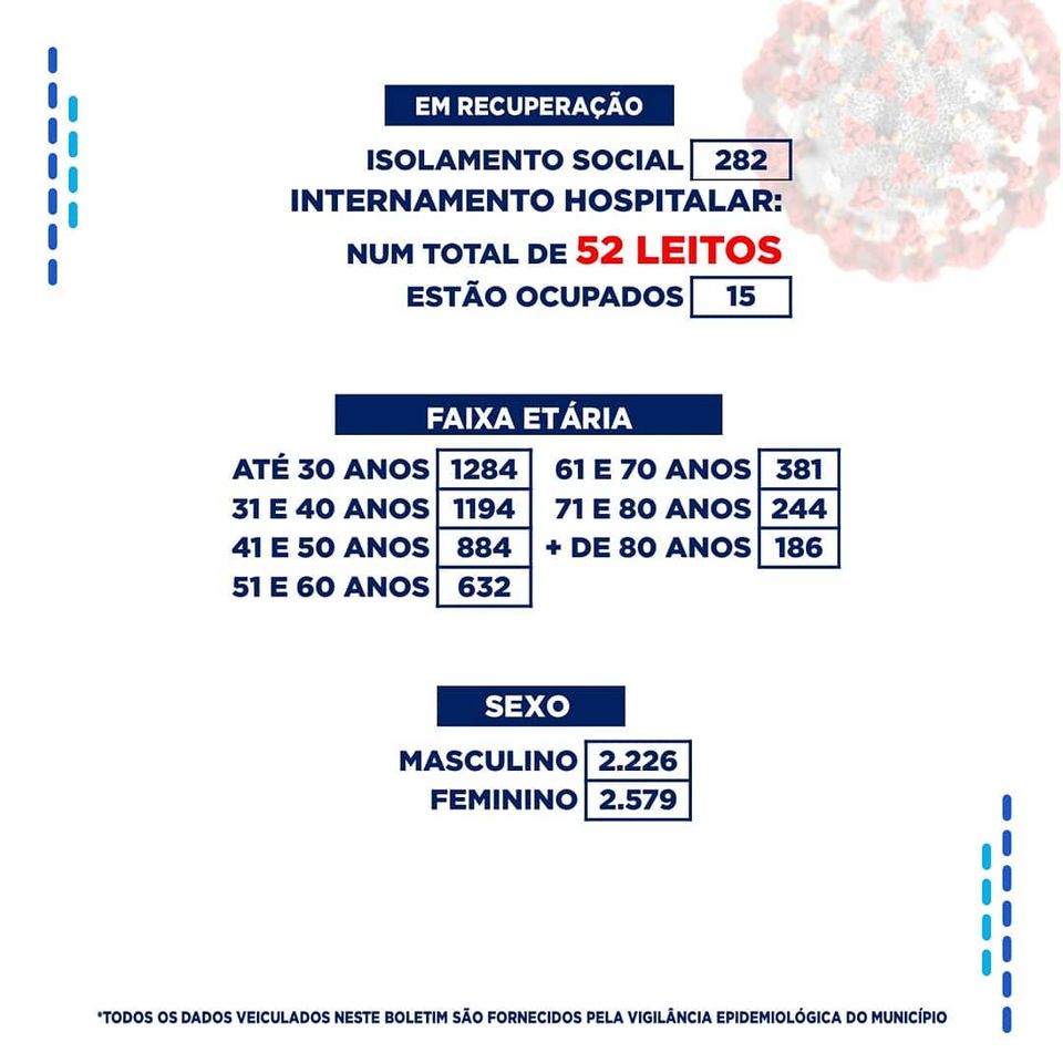 No levantamento feito dos leitos hospitalares, dos 52 disponíveis, 15 estão ocupados. Dos registros de infectados feitos por localidade, o bairro do Jatobá segue na frente com 615 casos. Por gênero, o sexo feminino segue na frente com 2.579 casos, e na faixa etária até 40 anos foram registrados 2.478 casos.