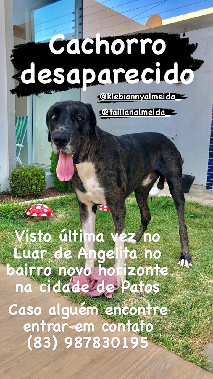 Uma mulher de nome Klebiannya Almeida está procurando seu cão que está desaparecido em Patos. Ele foi visto pela última vez no Luar de Angelita, no bairro Novo Horizonte.
