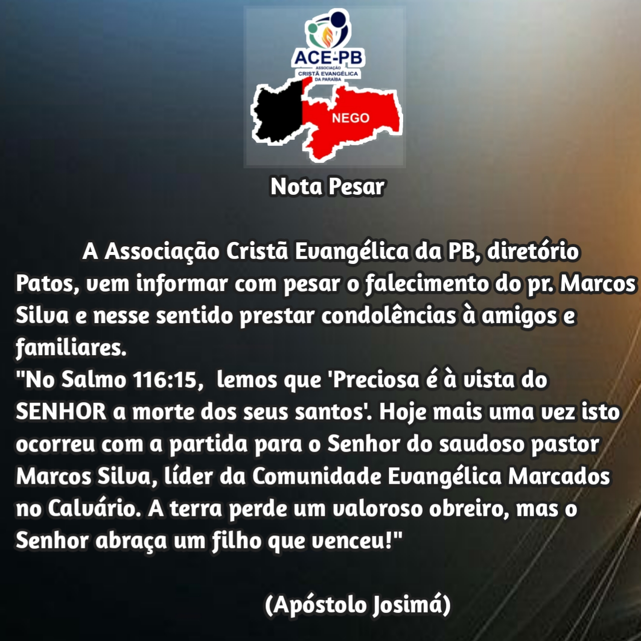 “Lamentamos profundamente o falecimento do nosso irmão Marcos Silva, uma pessoa dedicada ao evangelho, realizava um importante trabalho, era um desbravador, um grande amigo, vai fazer muita falta. Que Deus conforte o coração de seus familiares”, disse Josimá Oliveira, presidente da Associação Cristã evangélica da Paraíba.