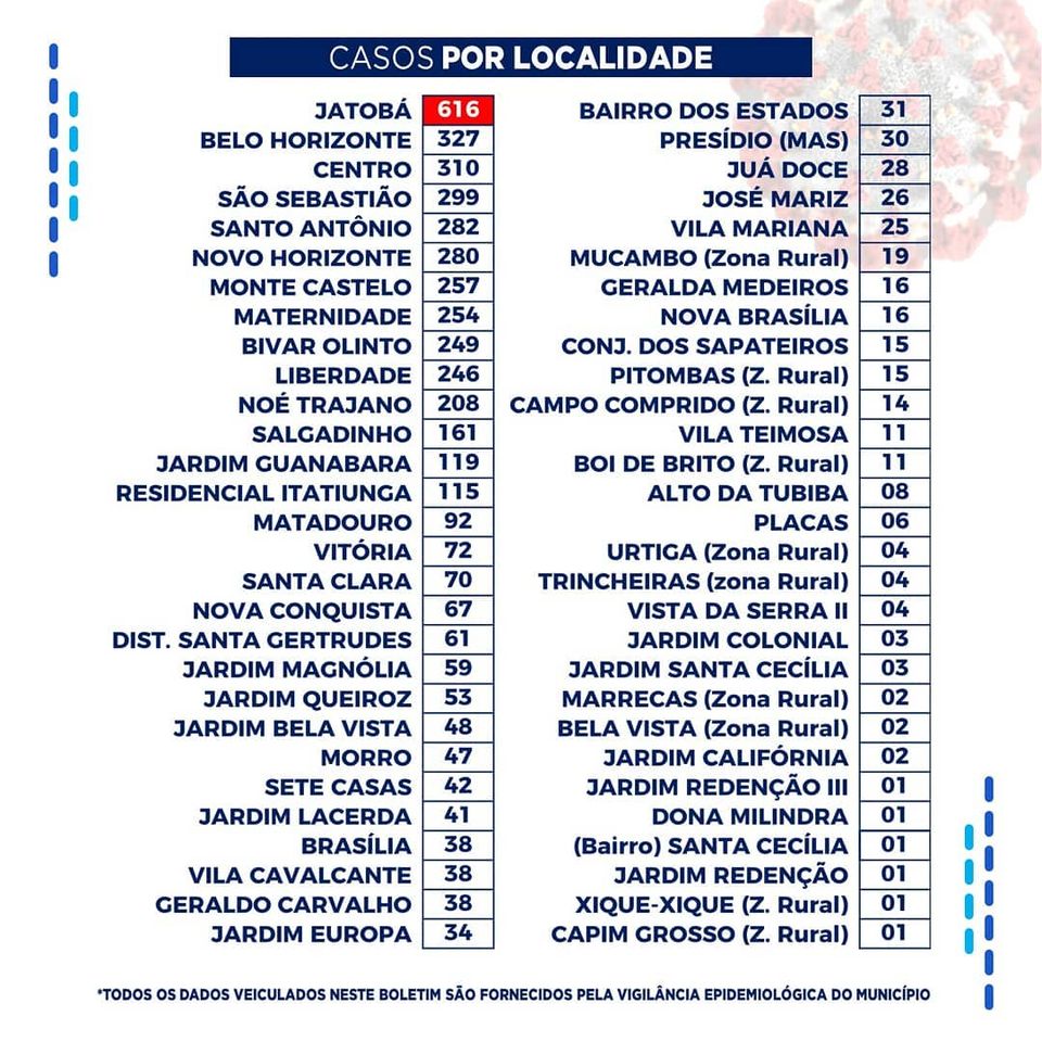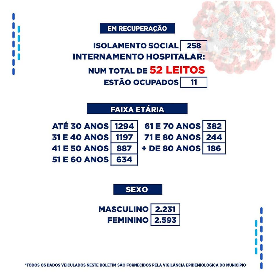 No levantamento feito dos leitos hospitalares, dos 52 disponíveis, 11 estão ocupados. Dos registros de infectados feitos por localidade, o bairro do Jatobá segue na frente com 616 casos. Por gênero, o sexo feminino segue na frente com 2.593 casos, e na faixa etária até 40 anos foram registrados 2.491 casos.