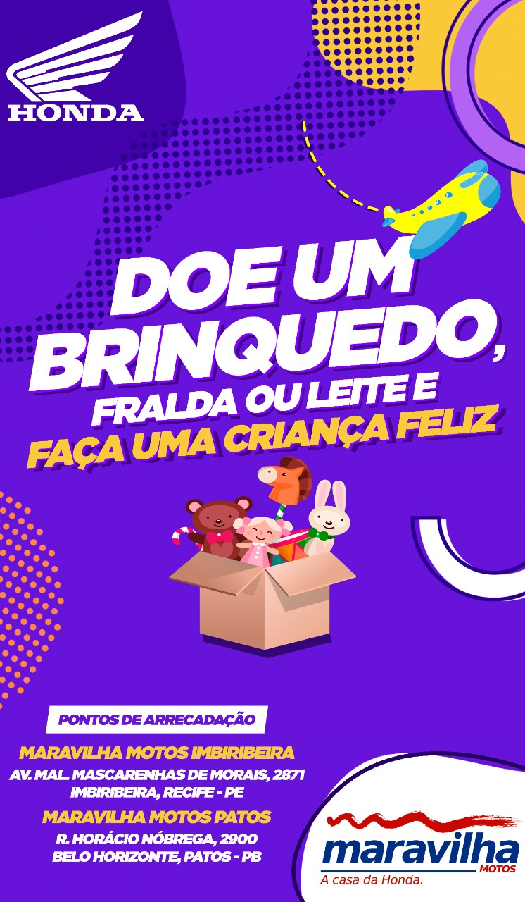 O Dia das Crianças se aproxima e a Maravilha Motos, em Patos, está fazendo uma campanha para arrecadar brinquedos. Doe um brinquedo, fralda ou leite e faça uma criança feliz!Tudo o que for arrecadado será doado para a ONG Operação Resgate, que realiza um belo trabalho social com as crianças do bairro do Mutirão, em Patos.