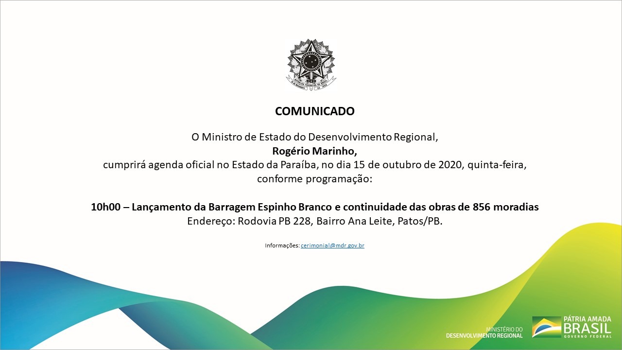 Nesta quinta-feira (15), o ministro do Desenvolvimento Regional, Rogério Marinho, faz visita oficial a Patos, onde na companhia do deputado Hugo Motta (Republicanos) fará o anúncio de obras para cidade.