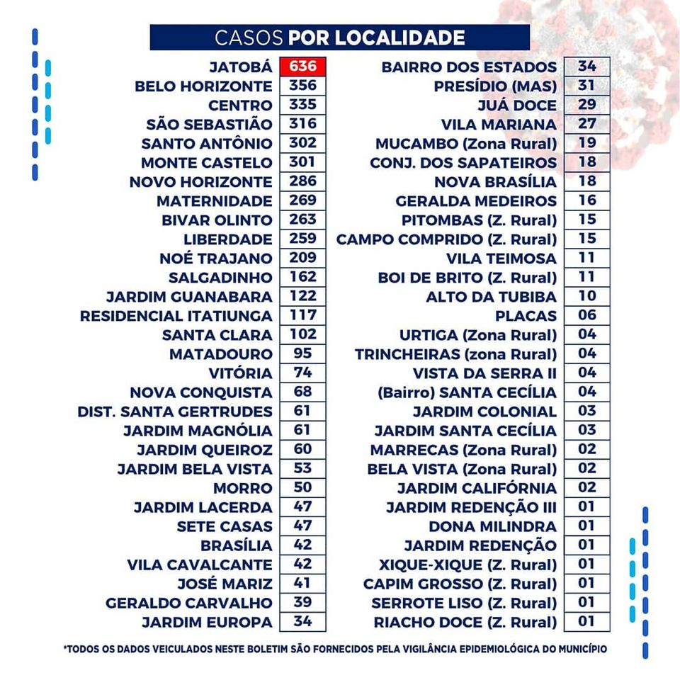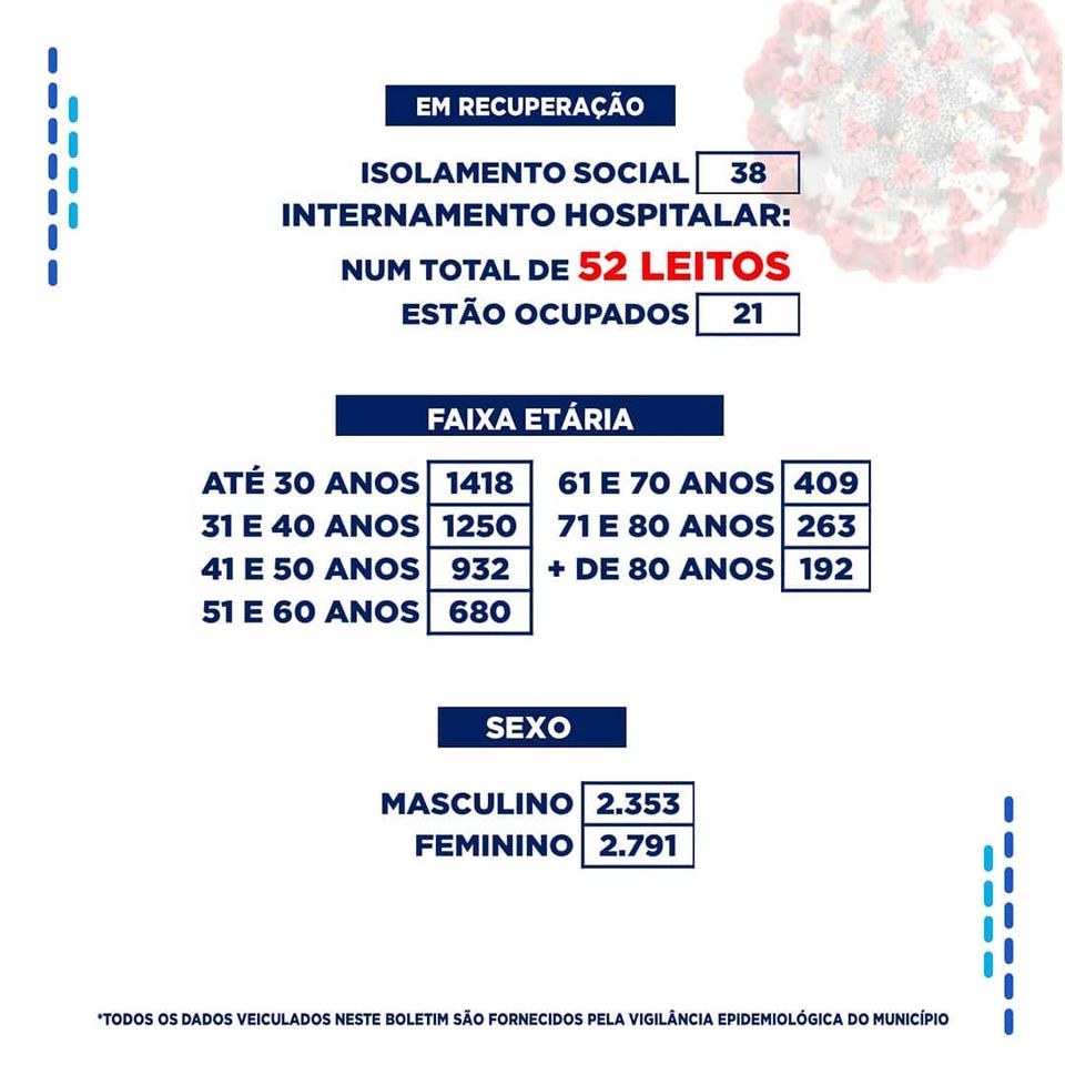 No levantamento feito dos leitos hospitalares, dos 52 disponíveis, 21 estão ocupados. Dos registros de infectados feitos por localidade, o bairro do Jatobá segue na frente com 636 casos. Por gênero, o sexo feminino segue na frente com 2.791 casos, e na faixa etária até 40 anos foram registrados 2.668 casos.